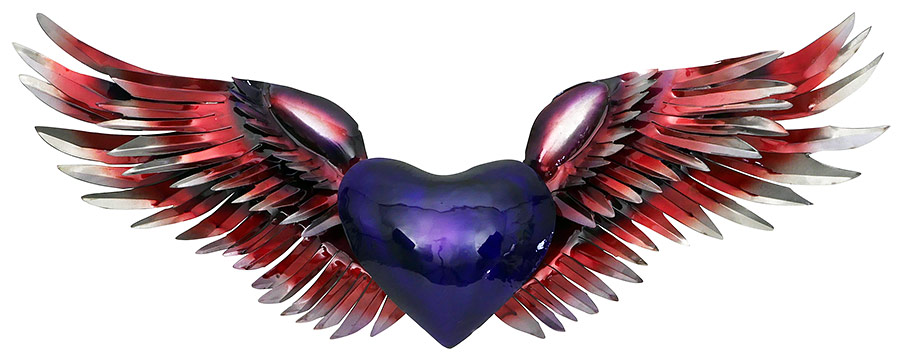 This 3D metal heart sculpture is brilliantly painted and constructed to create multi-layered wings. The heart with wings is made with multiple layers of cut and bent sheet metal to create the 3D relief. Add a pop of color to any décor with our metal 3D wall sculptures.