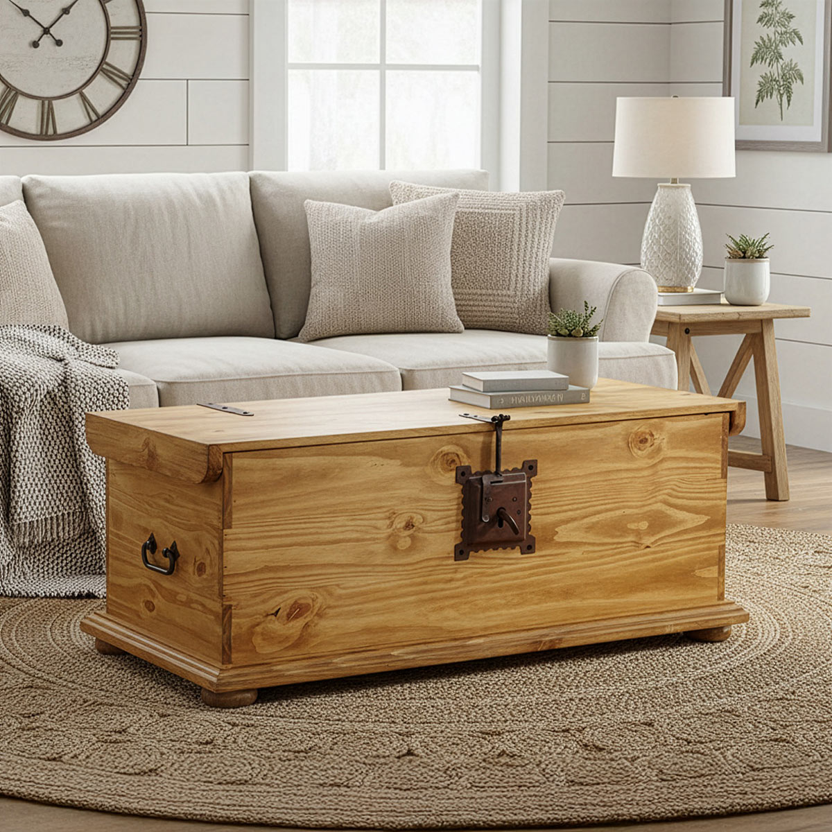 This rustic trunk coffee table is the ideal storage solution for your living room or family room. They are beautifully handcrafted from solid kiln-dried pine and accented with rustic iron hinges and a locking latch. These classic Mexican pine trunks are right at home in any rustic decor including rustic, southwest, log cabin and Santa Fe styles. Perfect storage for blankets, afghans, games and more.