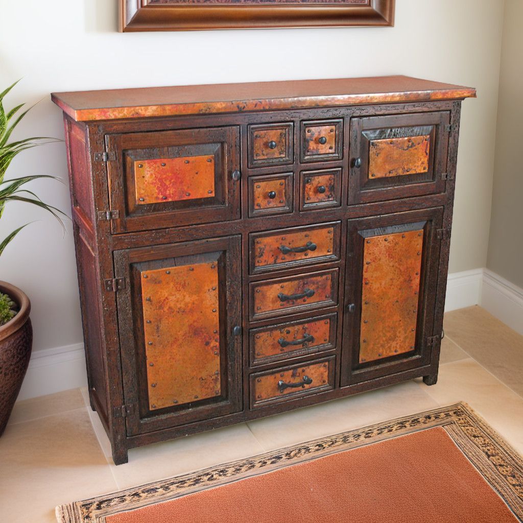 This old wood credenza with copper top and copper panels is exquisitely hand crafted. There's plenty of storage space in this beautiful piece. The rustic look is complete with the addition of the rustic iron drawer pulls and handles. From a rustic log home to a Southwest or Tuscan style estate, our copper line of furniture will add casual elegance to your decor.