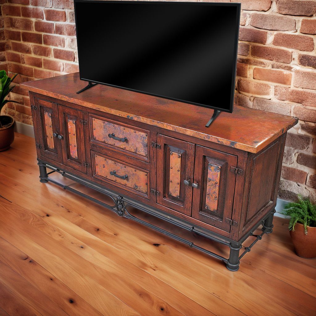 This beautiful copper and old wood TV console is exquisitely hand crafted with rustic wood, copper top, copper panels and a forged iron base. The rustic look is complete with the addition of the rustic iron drawer pulls and handles. From a rustic log home to a Southwest or Tuscan style estate, our copper line of furniture will add casual elegance to your decor.