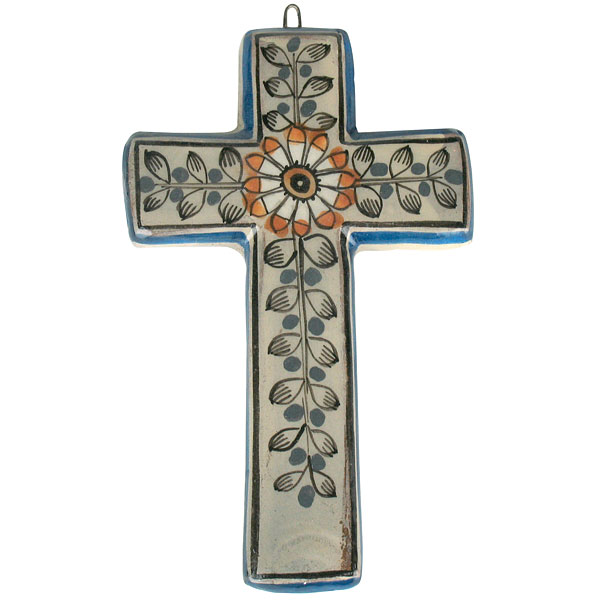 This small clay cross has exquisite floral designs and was handcrafted in the Tonala region of Mexico. Mexican ceramic folk artist Florentino Jimon Barba creates mostly highly detailed miniatures with earthy blues, reds, greens and blacks. These ceramic pieces are all signed and make wonderful collectors items. Direct From Mexico will carefully pack your order to ensure its safe arrival to you. These ceramic pieces are one of a kind. The design you receive will be different than the one pictured here.