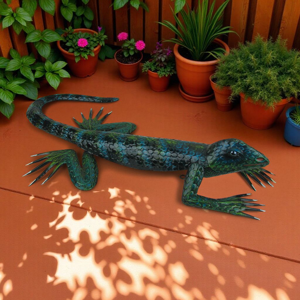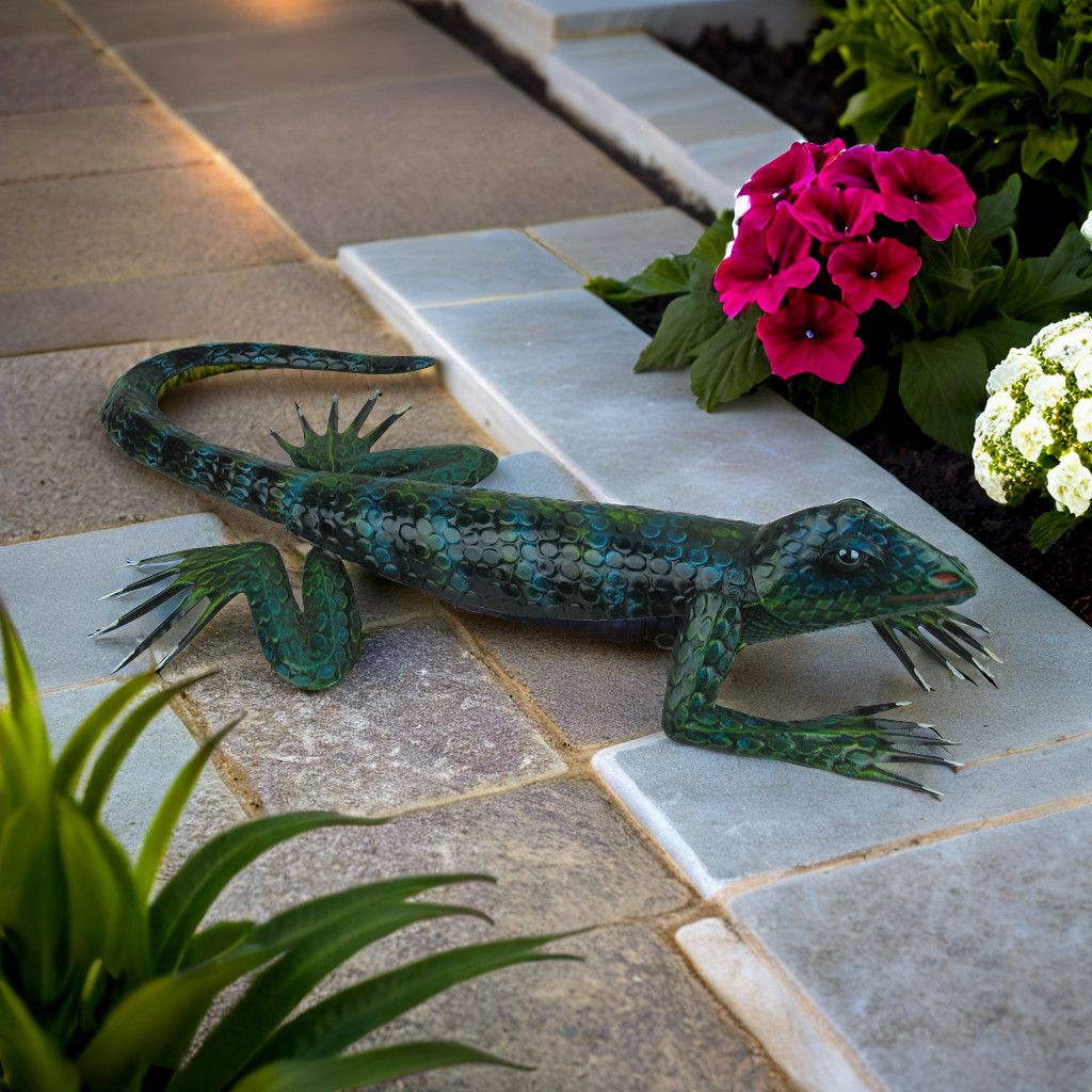 This large painted tin iguana sculpture showcases the talent of the Mexican folk artists. Each iguana is crafted with great attention to detail and hand painted to create a realistic interpretation of this creature's natural beauty. Each iguana sculpture is hand painted and may differ slightly from the image shown.