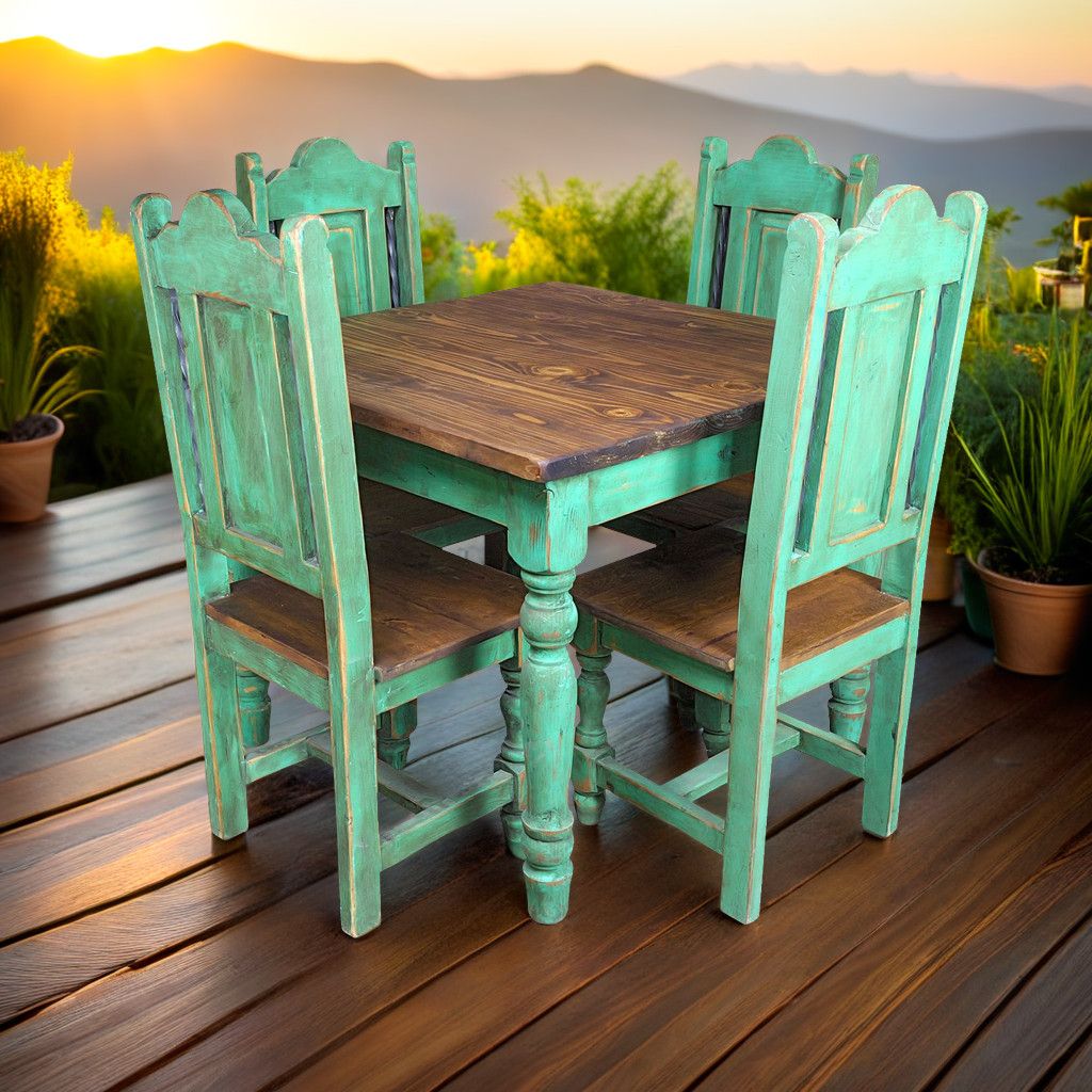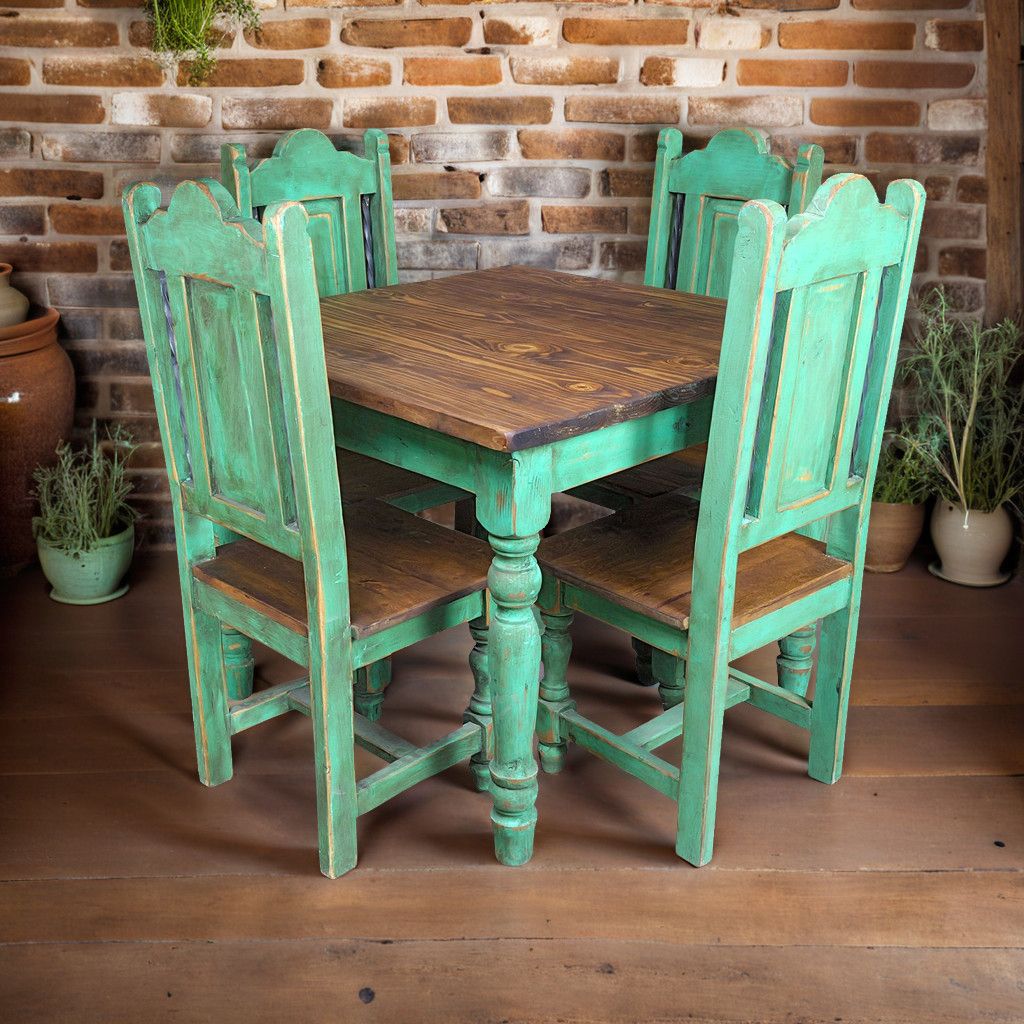 Add a unique touch to your dining space with this colorful green painted wood dining table with four matching chairs. The spindle turned legs and a natural wood tabletop give this dining table its classic Mexican Colonial style. Each hand painted chair features twisted iron accents and is crafted to be sturdy and durable.