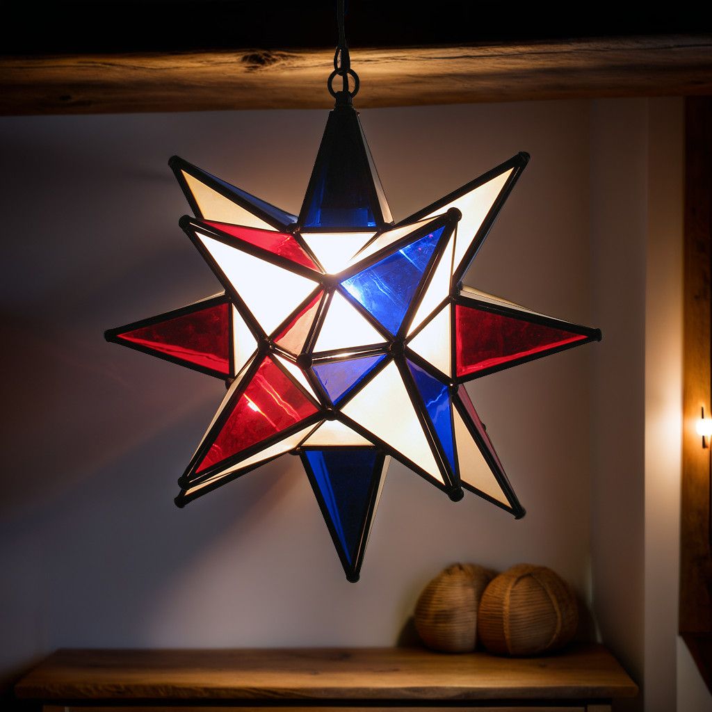 This patriotic hanging star light with red, white and blue colored glass is designed to create festive lighting to accent any decor. All of our hanging star lights are authentic creations handmade by artisans in Mexico. Accent your own southwest home or give a starlight as a gift.