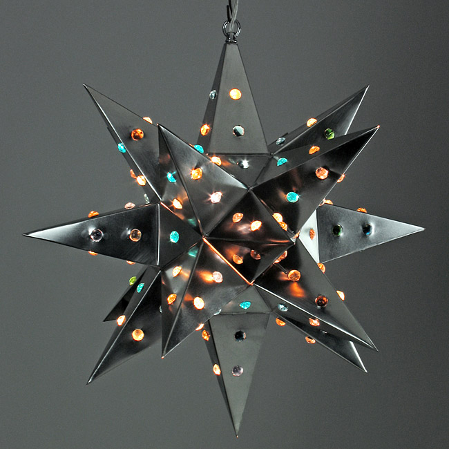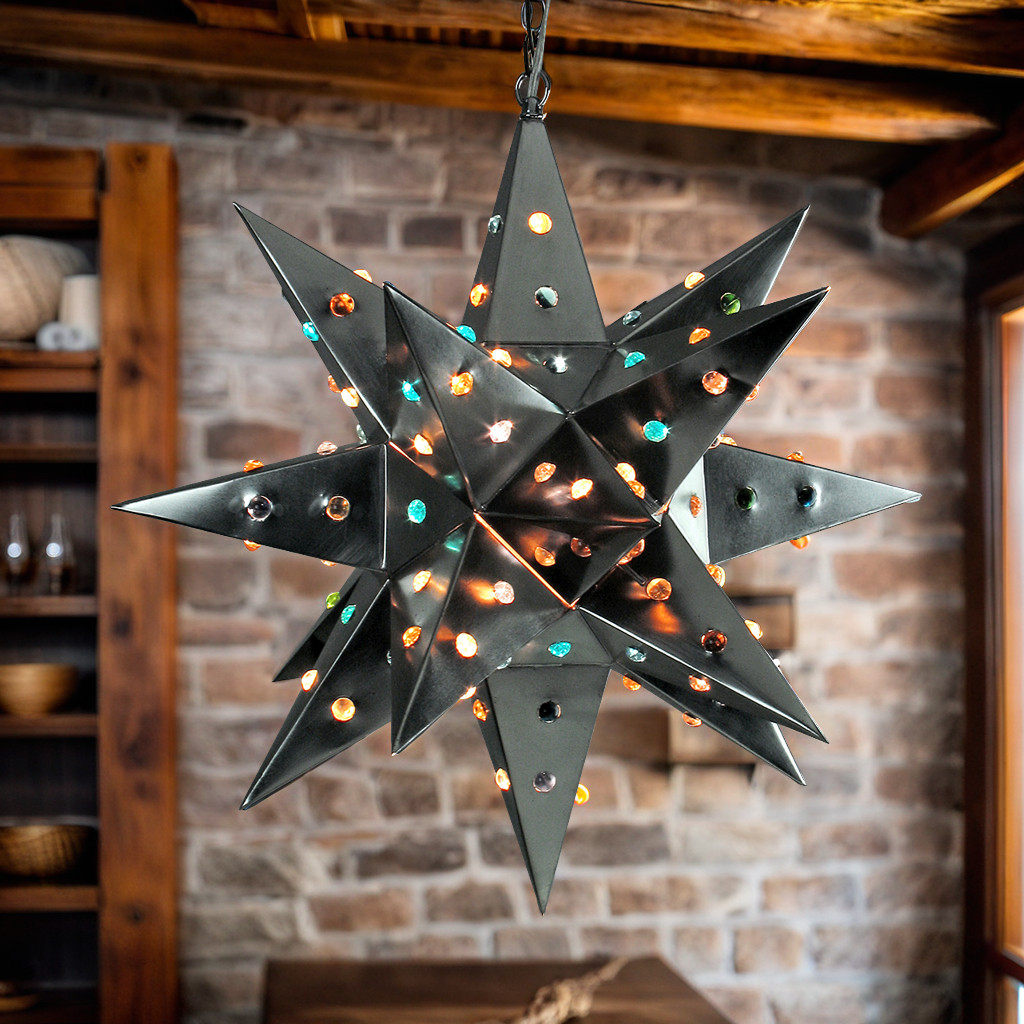 This large 20" dia. natural tin star light with colorful glass marbles will create an inviting glow to any southwest or Mexican style interior or exterior decor. Our Moravian style tin star lights are handcrafted by artisans in Mexico. These natural tin hanging star lamps complement any southwest, Mexican or rustic decor.