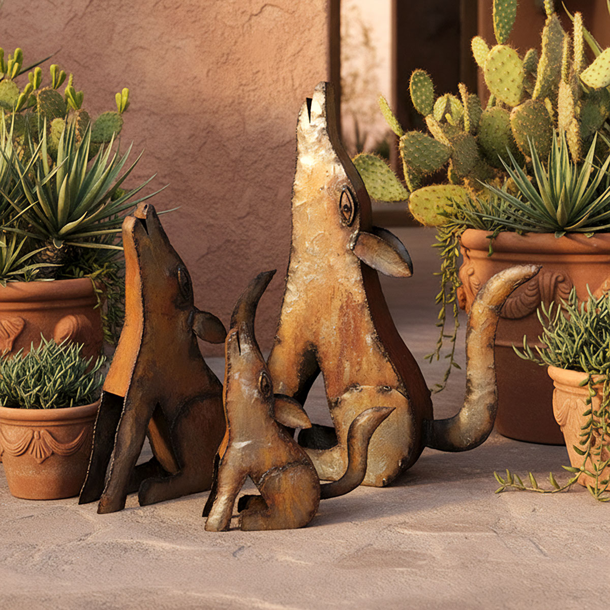Set of 3 Rustic Metal Coyote Yard Art Sculptures