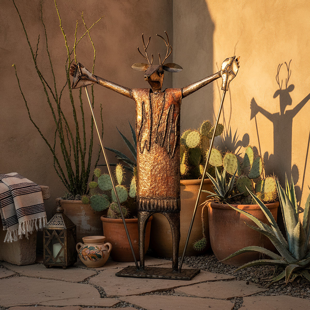 This captivating metal deer dancer sculpture depicts the ceremonial dance performed by native Yaqui tribes of Sonora Mexico and the old southwest. The traditional deer dance was believed to bring a successful hunt and prosperity to the tribe. Our rustic metal yard sculptures are hand fabricated by artisans in Mexico.