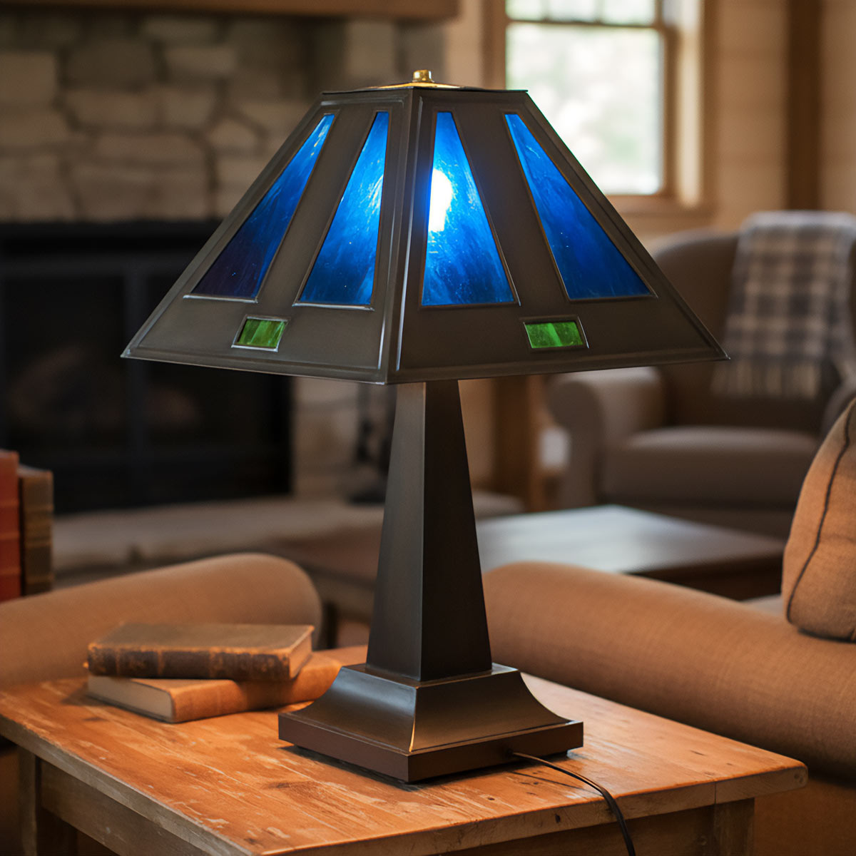 The perfect rustic lamp for your desk, coffee table, hall table or nightstand. The handcrafted tin shade features blue and green colored glass inlays. Our rustic metal lamps will illuminate any southwest or rustic decor in your home or cabin. The aged tin lamp bases and shades are individually hand crafted by the talented tinsmiths of Mexico.