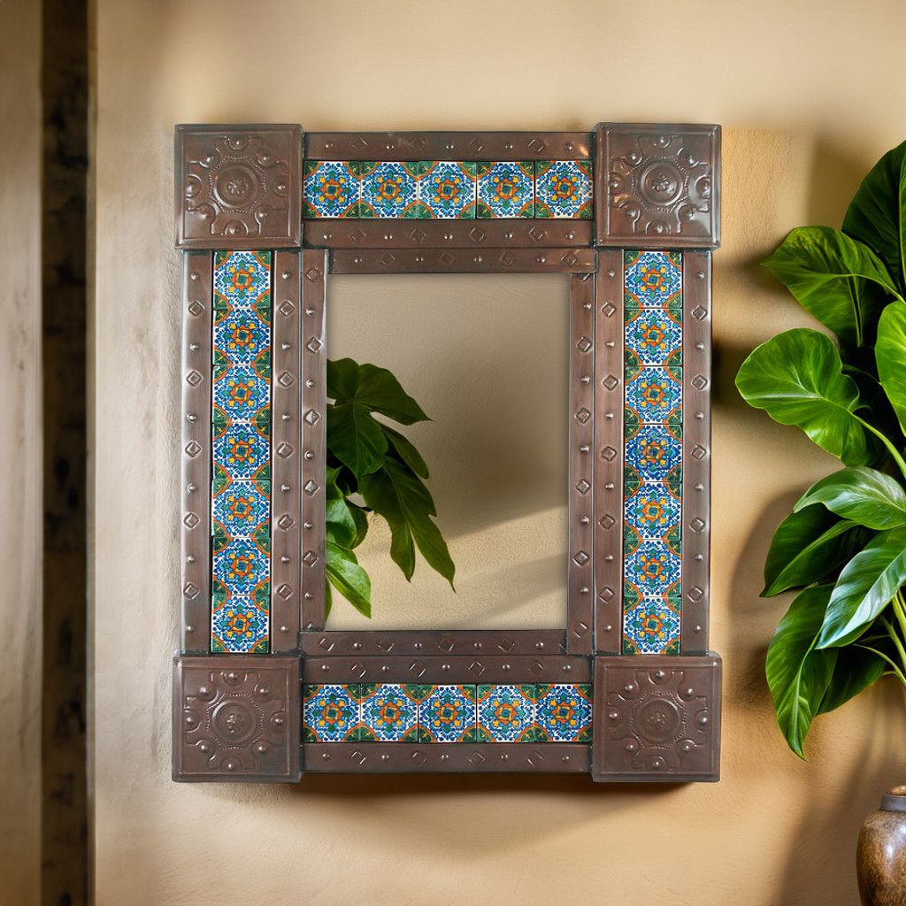Mexican Embossed Tin Mirror With Mixed Talavera Tile - 20" x 24"