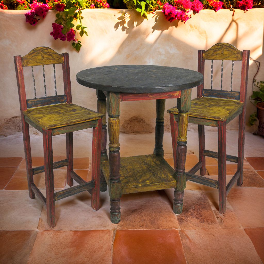 This Mexican country bar table and stools will enrich any old southwest or rustic decor with its colorful antique look. The one-of-a-kind character of our handpainted wood furniture is enhanced by the patina wash and unique wood grain of each stool and table.