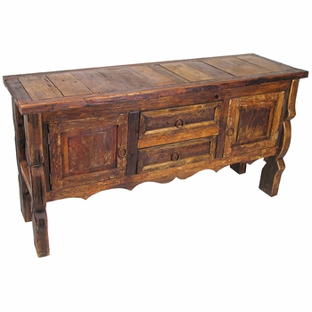 This ox yoke buffet table will enrich any southwest or rustic decor with an authentic Spanish Colonial or Mexican hacienda theme. Working with mostly old doors and old wood, craftsman create these tables with the texture and character of a rustic antique from Spanish colonial times. The one-of-a-kind character of our old wood furniture is enhanced by the age-old grain, weathering, and old rustic hardware that still remains on the wood.
