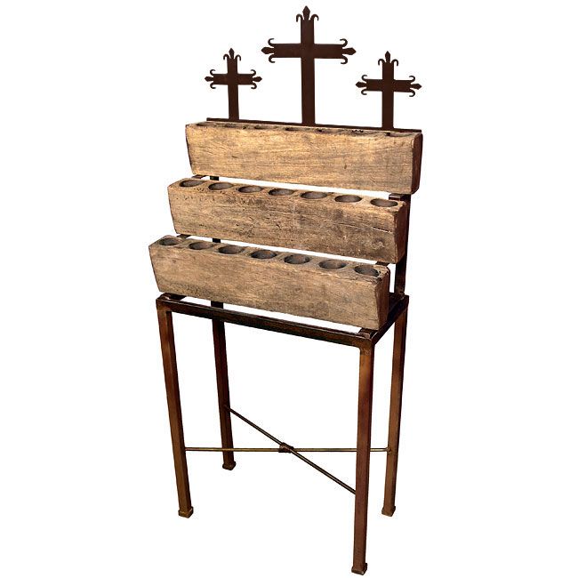 This rustic iron base with crosses and three rows of sugar mold candle holders is the perfect addition to a Mexican religious home altar. The sugar mold candle holders will hold 21 candles.