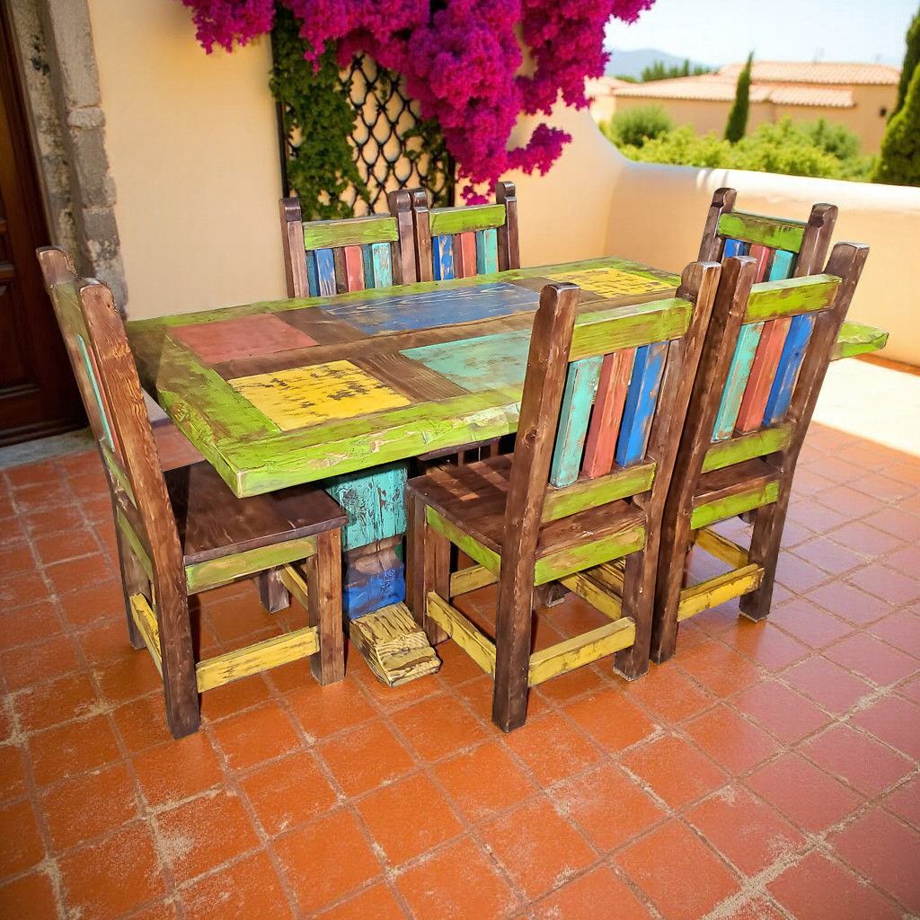 This rustic and colorful 7-piece painted wood dining set will add beautiful touches of color to any southwest or rustic decor. The thick pedastal base and top make this dining table a sturdy feature for your dining room or kitchen.