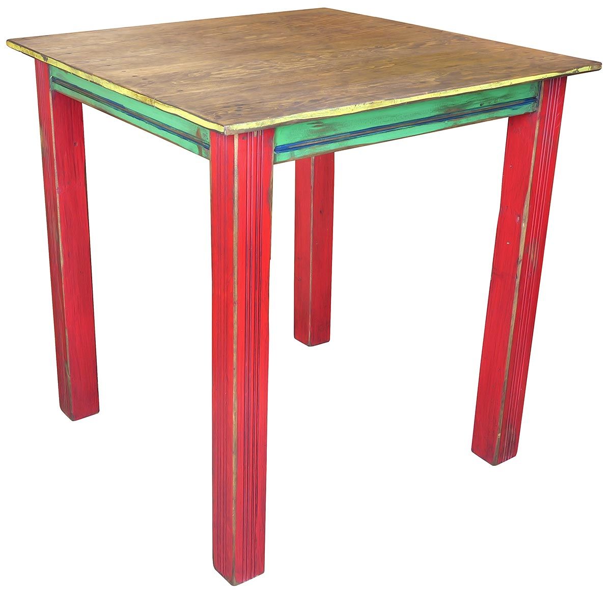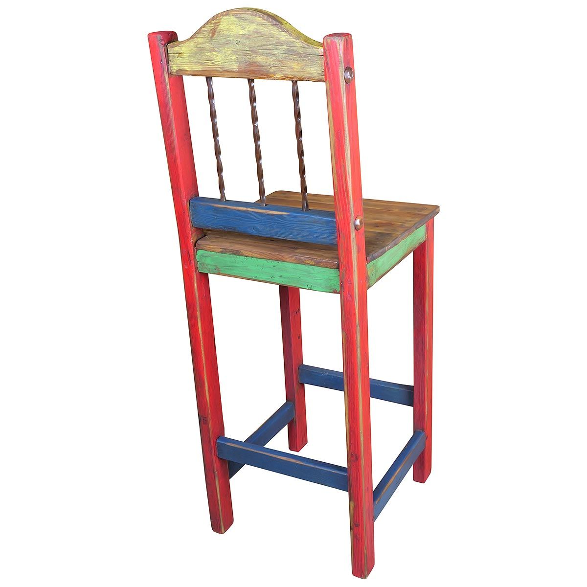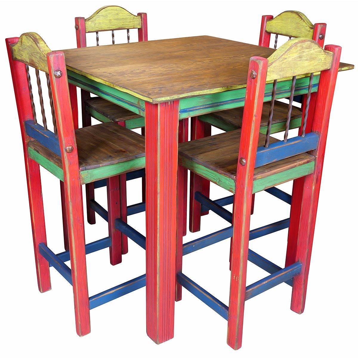 Bring a burst of vibrant Mexican color and rustic charm to your home with this Multi-colored Tall Bistro Table Set with 4 Chairs. Handcrafted by skilled artisans in Mexico, this lively bistro set features a natural wood tabletop and seats complemented by a playful mix of bright hand-painted colors—red, green, blue, and yellow. The tall, sturdy pine construction and hand-distressed finish create an authentic rustic look that celebrates traditional Mexican craftsmanship and artistic expression.