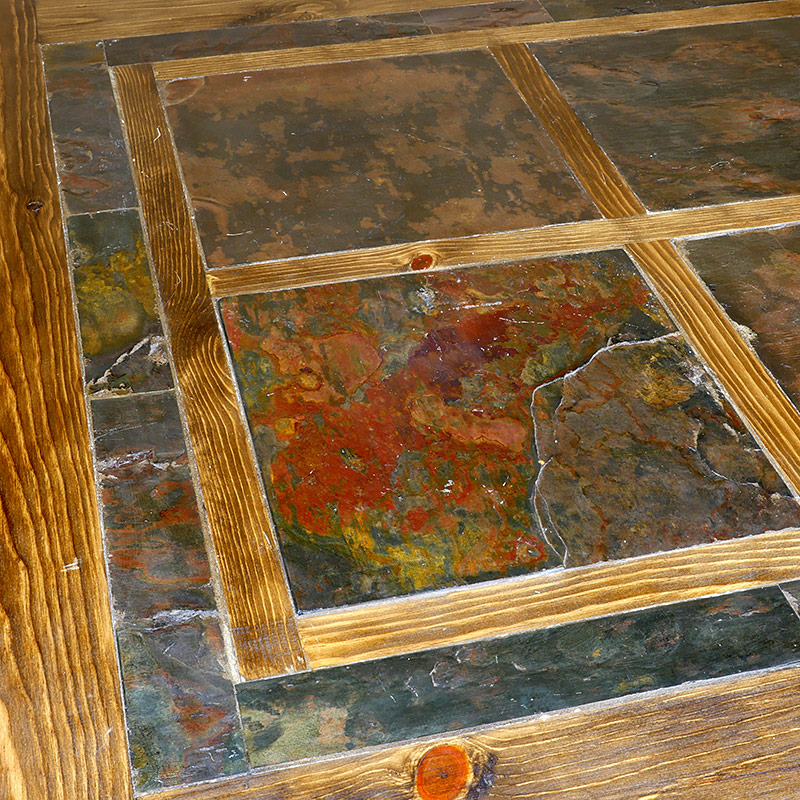 This counter height 42" square rustic wood bistro table features ox yoke legs and an inset slate top. Set the tone for your Mexican cantina or rustic dining decor with this sturdy, solid wood dining or bistro table. All of our rustic wood cantina furniture is hand crafted by talented wood workers in Mexico.