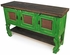 This rustic green buffet hutch with ox yoke legs is a versatile piece for your dining room, living room or hall. This hand crafted hutch with a rustic wood top and lower shelf features an iron band with rustic nail heads and tin panelled doors. Built to last, this unique painted wood buffet will serve your family for many years to come.