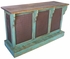 This painted wood rustic bar set with three bar stools features aged metal panels and plenty of storage space. This unique rustic bar will looks great in any southwest ranch or rustic decor with its colorful antique look. The sturdy bar stools also feature a rustic metal panel inlay on back.