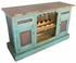 The back side of the bar has 2 drawers, 2 lower cabinets with shelves, wine rack and wine glass holders. The one-of-a-kind character of this rustic wooden bar is enhanced by the patina wash and unique wood grain.