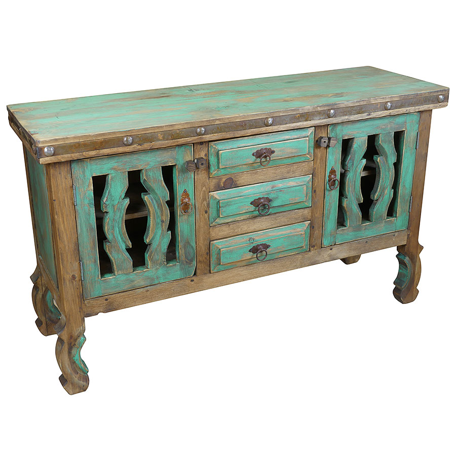 This rustic buffet with ox yoke carved legs features a mix of green patina finish and natural wood top with carved door fronts. The rustic iron band, nail heads and ring drawer pulls complete the piece to make it a perfect fit for any southwest or Mexican colonial decor.