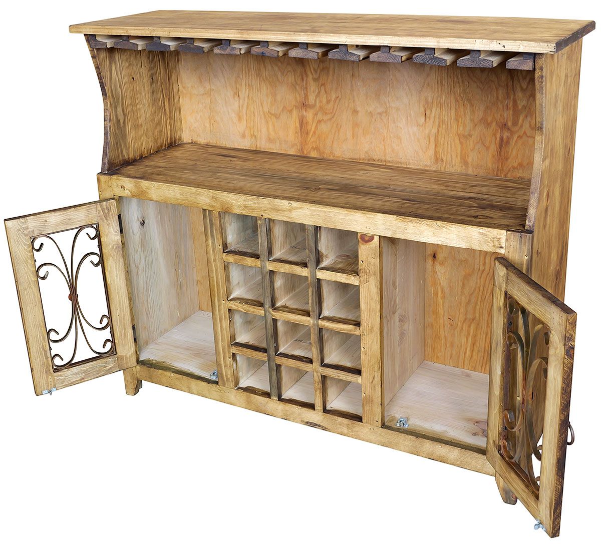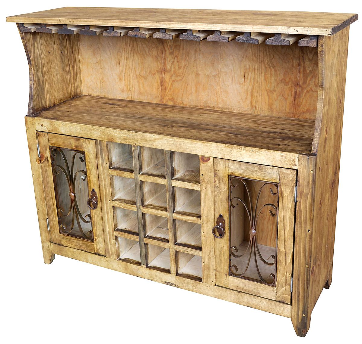 Designed for both beauty and storage, this Mexican pine hutch features built-in wine cubbies, two doors with decorative iron grilles, and a spacious shelf with hanging wine glass racks above. The open upper shelf is ideal for displaying your favorite glassware or décor, while the lower cabinet provides ample storage for bottles, barware, or dining accessories.