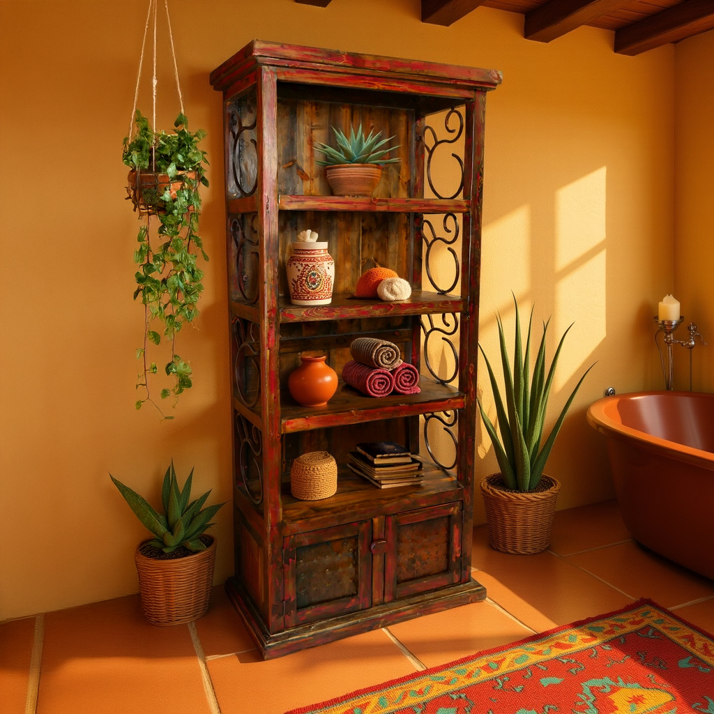 This rustic red bookshelf with scroll iron work sides and lower storage cabinet is the perfect match for any southwest or Spanish Colonial style decor. Expertly hand crafted, this cabinet with four shelves and lower storage doors can display pottery and other collectables or books and china. The one-of-a-kind character of our old wood furniture is enhanced by the age-old grain, weathering, and rustic iron hardware.