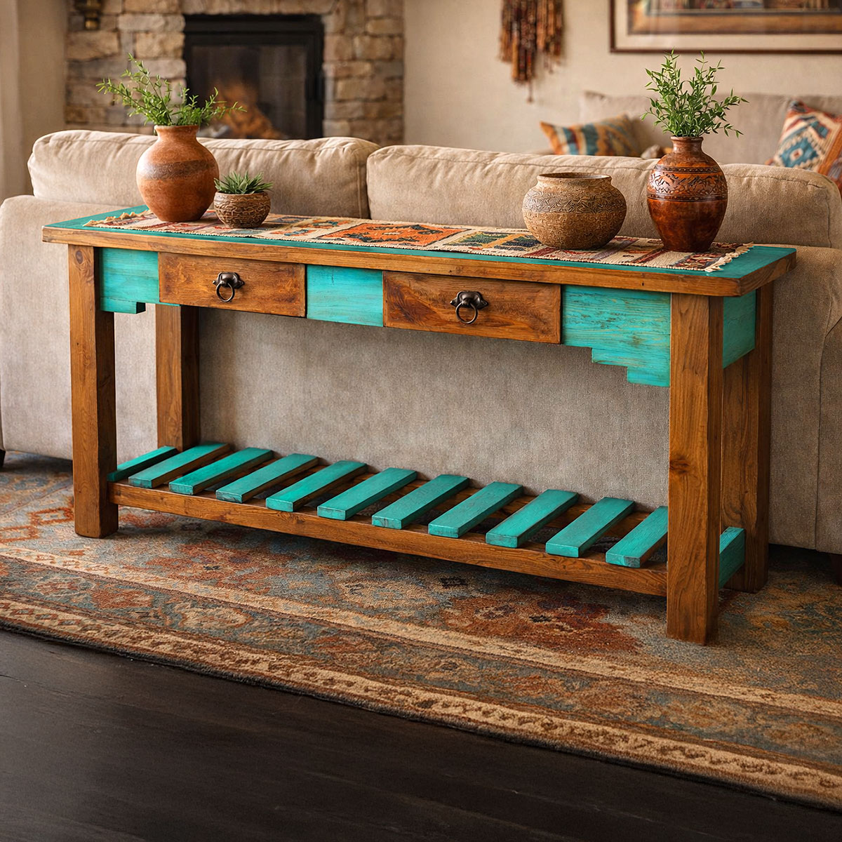 Add a touch of Southwestern allure to your living space with our Santa Fe sofa table. Whether placed behind your sofa as a statement piece or used as an accent table in your entryway or hallway, this Santa Fe Table enhances the aesthetics of any room. The table features two drawers with iron drawer pulls and a lower slat shelf, providing ample storage space for your essentials. Keep remote controls, keys, or small decor items organized and within reach, keeping your living space neat and tidy. Its solid construction ensures stability and longevity, allowing you to enjoy the charm of Santa Fe for years to come.