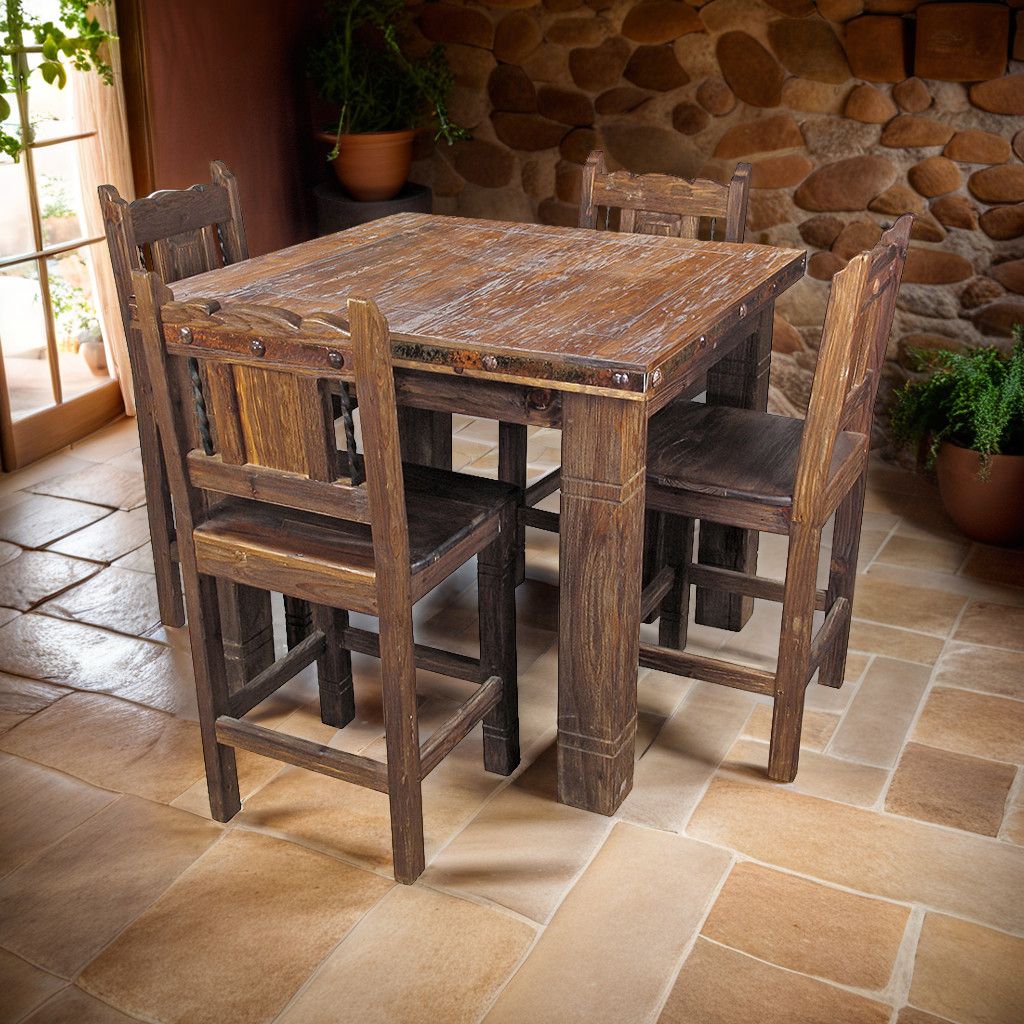 This rustic counter height bistro table will enrich any ranch, southwest or Mexican cantina or home dining decor. This sturdy, solid wood table is accented with a wrought iron band and rustic nail heads around the edge. All of our rustic wood tables are hand crafted by talented wood workers in Mexico.