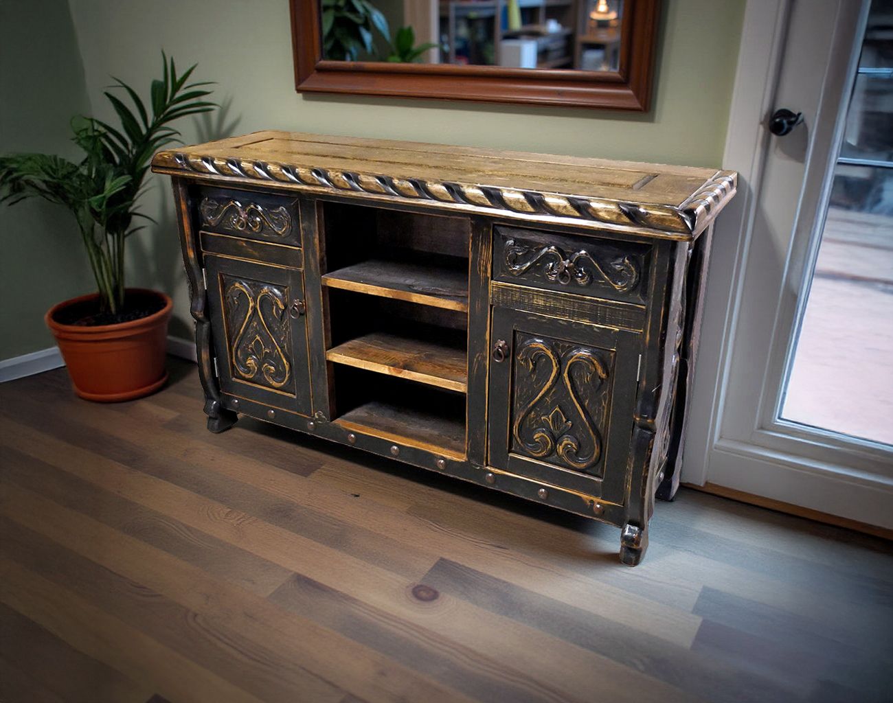 This black and brown rustic style entertainment console with beautiful scalloped edge and swan carvings is perfect for your flat screen television. This TV console features three shelves, two drawers and two doors for plenty of storage. The one-of-a-kind character of our rustic wood furniture is enhanced by the rustic iron door pulls and hand carved southwest designs in the wood.