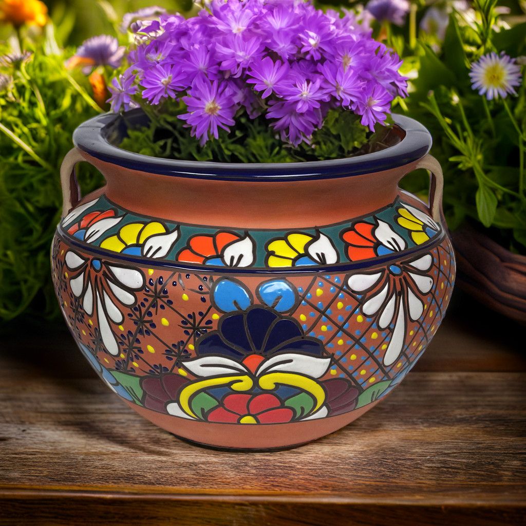 This beautiful Talavera flower pot with handles features exposed terracotta to set off the colorful raised Talavera design. Hand crafted an painted in traditional Talavera designs, these quality Mexican flower pots are sure to add southwest color to your garden, patio or entry way. Inside of pot is glazed for years of use and enjoyment.