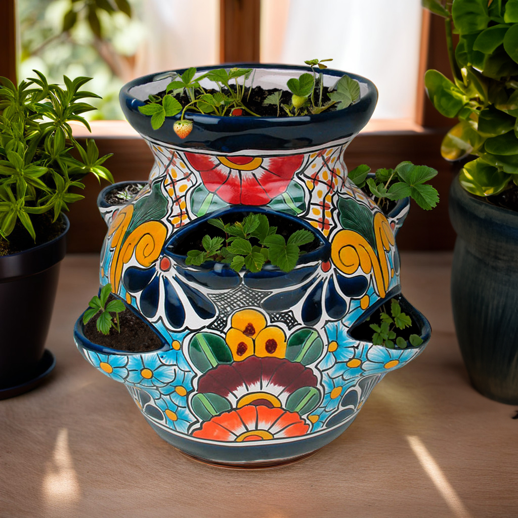 This Talavera strawberry planter pot will add a splash of color to your garden, patio or any room in your home. Use this beautiful planter with open side pockets to grow herbs, flowers, strawberry plants and more. Our Talavera flower pots are handmade and handpainted by Mexican artisans.