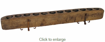 This 12-hole rustic wood sugar mold candle holder comes with 2 iron bases. This rustic candle holder is made from weathered Spanish oak and has the wear and individuality to make the perfect addition to your rustic home decor. Each piece is a unique one-of-a-kind wooden sugar mold. Expect variations in size, wood texture, distressing, cracks, warping, weathering and color.