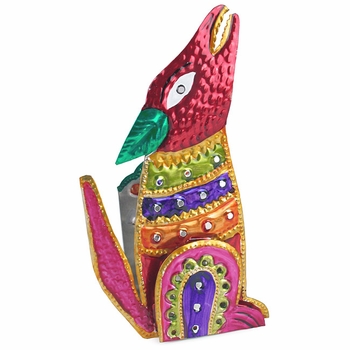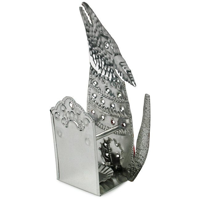 This howling coyote candle sconce is hand crafted from tin and makes an excellent Mexican folk art addition to any room. This fun candle sconce can be hung on the wall or it can sit on a shelf or sofa table to show off it's flickering candle light. Our painted tin candle sconces are all cut, punched, etched and painted by hand one at a time by Mexican metalcraft artisans.