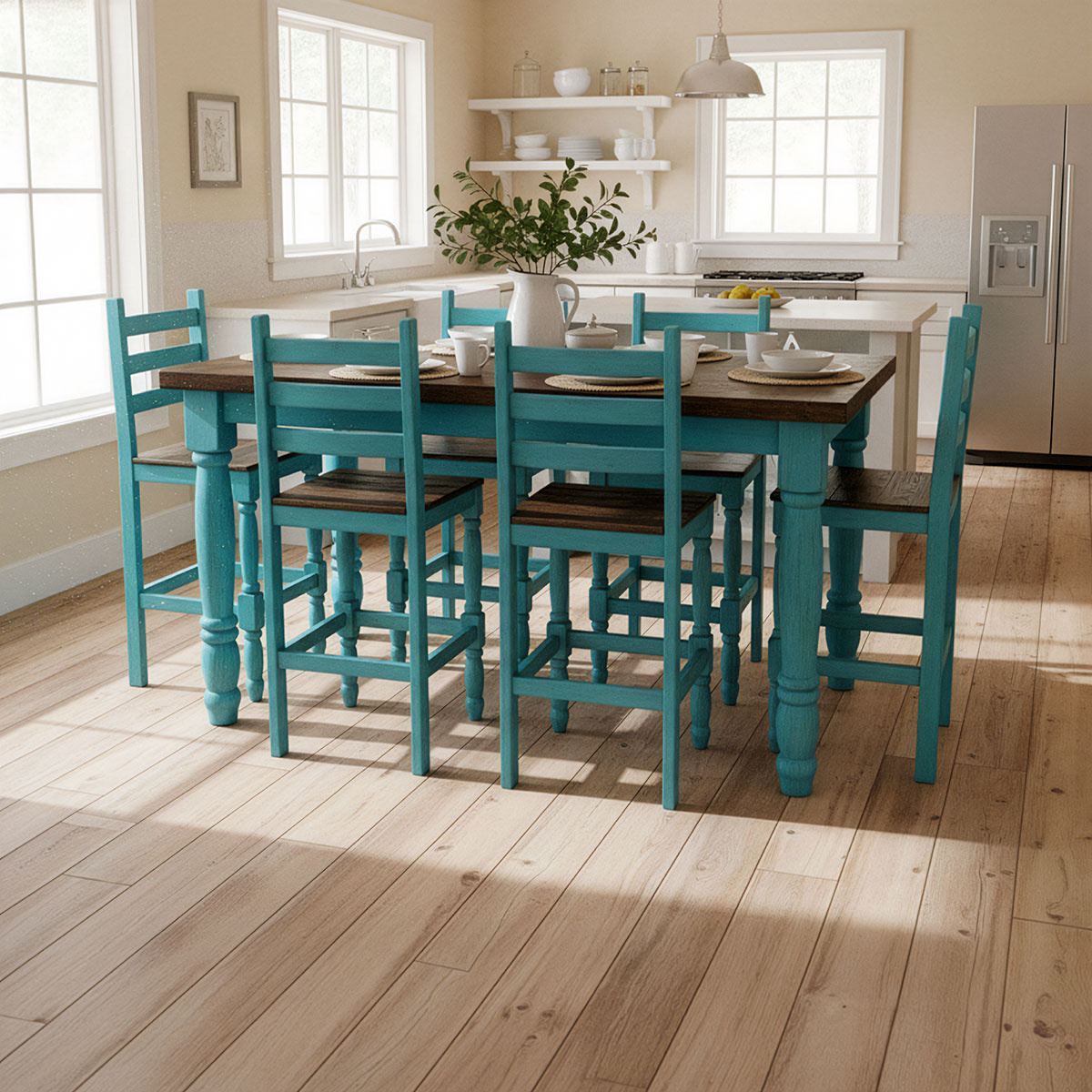 Bring vibrant Mexican charm to your home with this Turquoise Rustic Painted Wood Bistro Set with 6 Chairs. Handcrafted by skilled artisans in Mexico, this solid pine bistro set features a beautifully distressed turquoise painted finish that highlights the natural wood grain and adds a touch of rustic elegance. The rich brown-stained tabletop and chair seats contrast beautifully with the turquoise base, creating a striking two-tone look that embodies classic Mexican country style.