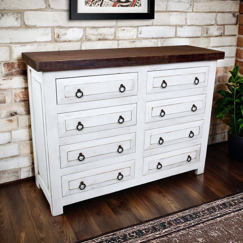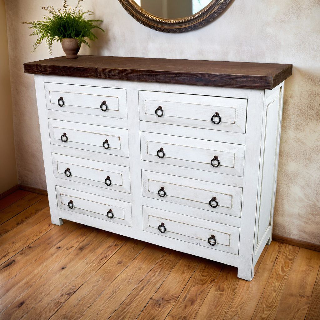 Bring rustic sophistication and everyday function into your home with this handcrafted 8-drawer Mexican dresser. Made from solid wood and finished in a distressed white wash, this piece beautifully blends classic Mexican charm with clean, modern lines. The dark stained top provides a warm contrast to the crisp body, while hand-forged iron ring pulls add an artisanal touch. With eight roomy drawers, this dresser offers ample storage for clothing, linens, or household items, making it as practical as it is stylish. Whether placed in a bedroom, hallway, or living space, this versatile piece will enhance your home with timeless character and durability.