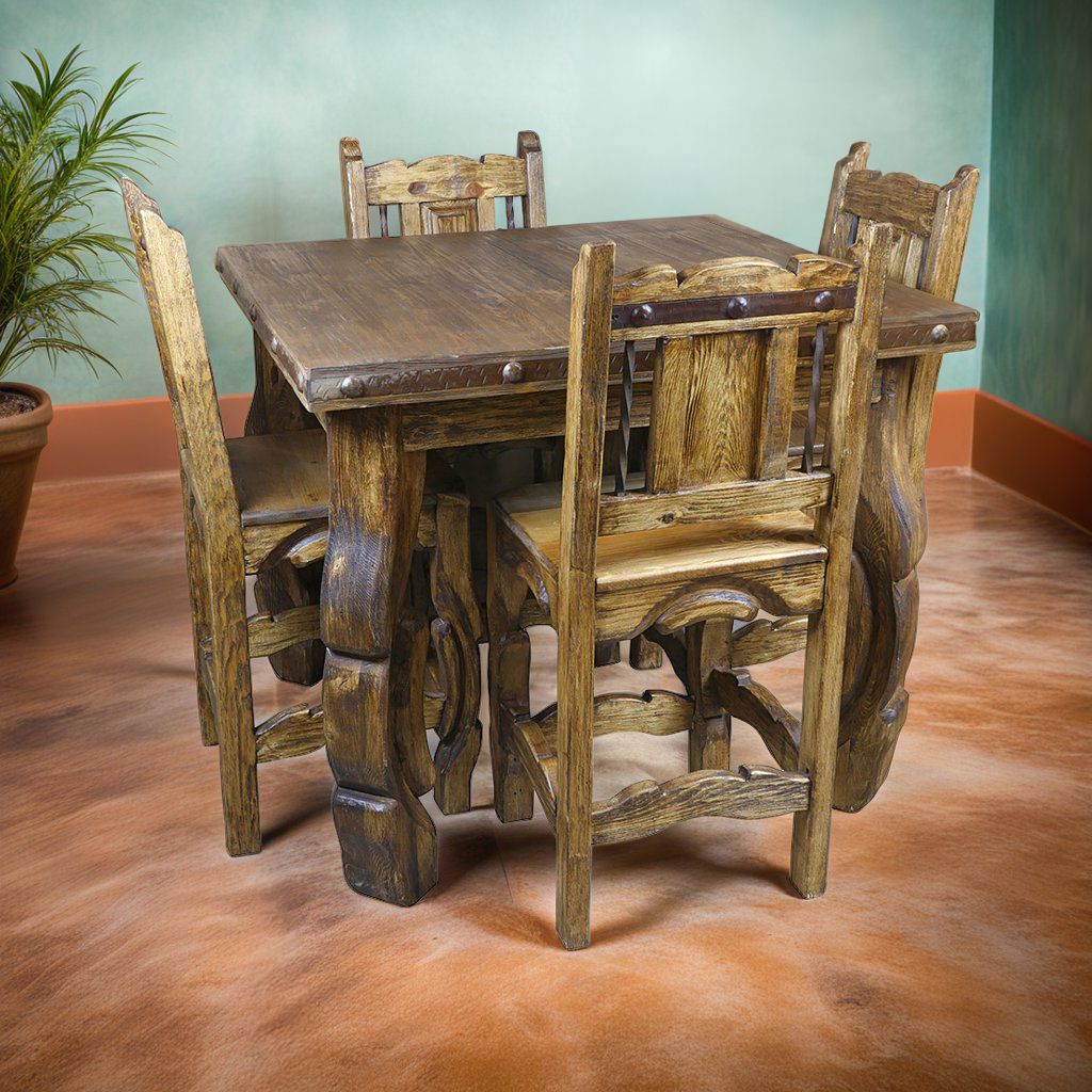 This 43" square rustic wood bistro table with four matching chairs features wirebrush yugo legs and a wrought iron band with rustic nail heads around the edge. The carved solid wood stools feature matching iron bands and scroll bars. Set the tone for your Mexican cantina or rustic dining decor with this sturdy, solid wood dining or bistro table. All of our rustic wood cantina furniture is hand crafted by talented wood workers in Mexico.