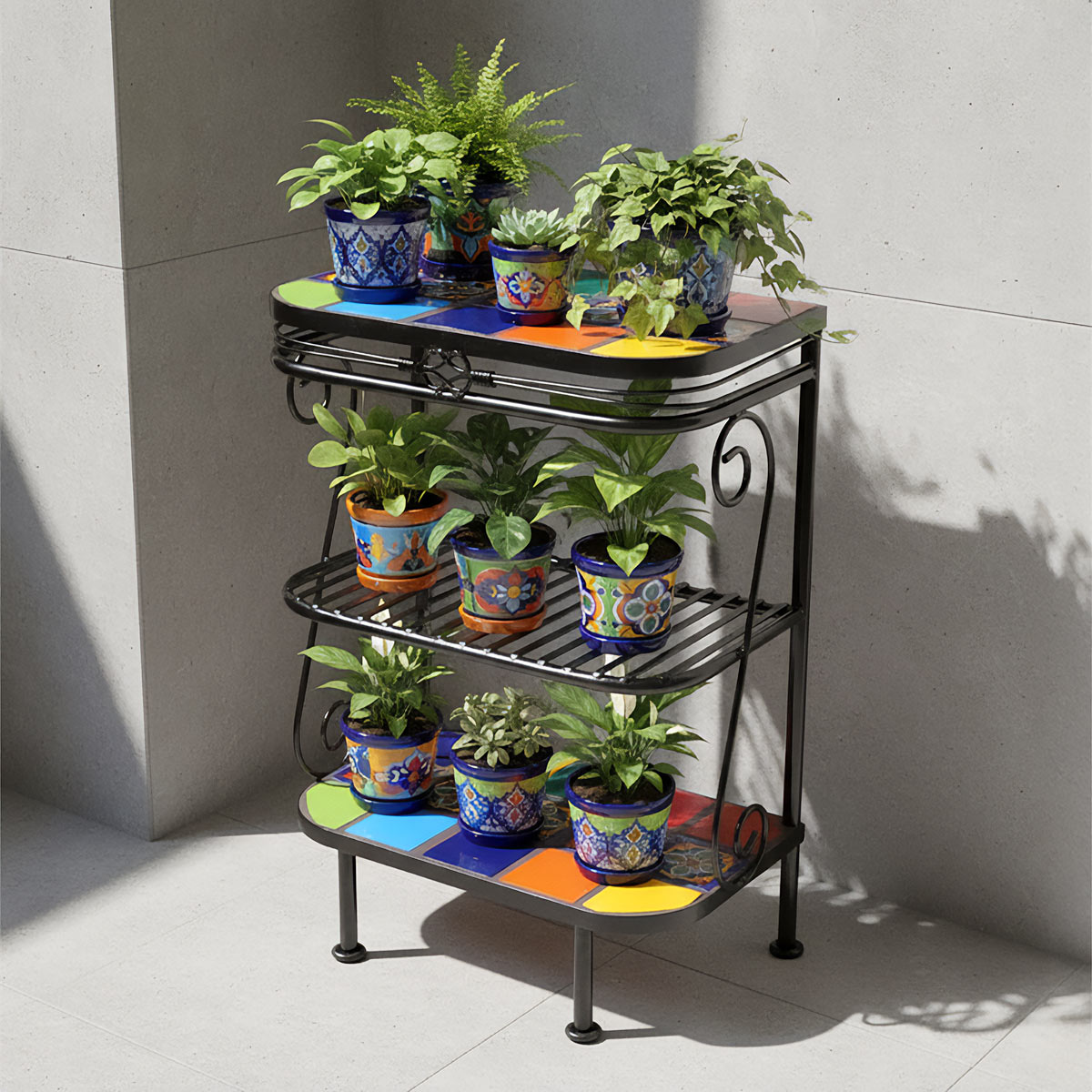 3-Tier Wrought Iron Plant Stand with Talavera Tiles